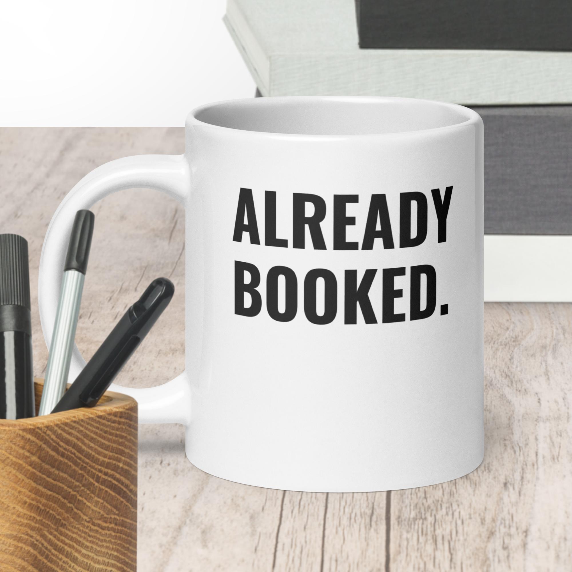 “Already Booked.” White glossy mug
